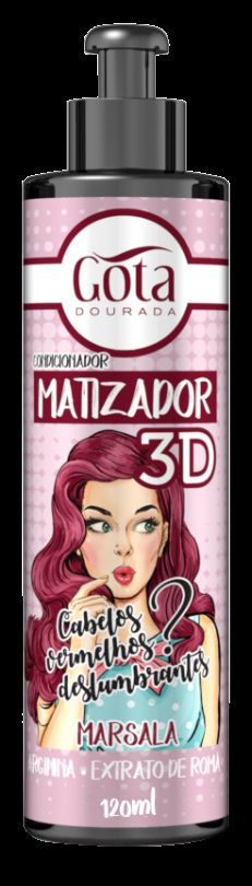 O Matizador Condicionador 3D Marsala Gota Dourada 120 ml é a escolha perfeita para quem busca cabelos vermelhos intensos e uma coloração duradoura. Com o poder de arginina e extrato de romã, ele proporciona uma nutrição profunda, fortalecimento e um brilho incrível aos fios.Benefícios do Matizador Condicionador 3D Marsala Gota Dourada 120 mlCom arginina e extrato de romã, o Matizador Condicionador 3D Marsala Gota Dourada 120 ml oferece resistência e uma cor vibrante, neutralizando os tons oxidados. Ele é ideal para cabelos vermelhos, proporcionando um efeito gloss 3D e brilho intenso.Como a Arginina Beneficia Seus Fios?Arginina: Um aminoácido essencial que fortalece a estrutura dos fios, reconstruindo os componentes internos e externos dos cabelos finos.Propriedades do Extrato de Romã para Seus CabelosExtrato de Romã: Possui propriedades antioxidantes que combatem os radicais livres, além de potencializar o brilho e ajudar a manter a coloração por mais tempo, sendo especialmente eficaz para cabelos com pigmentação.